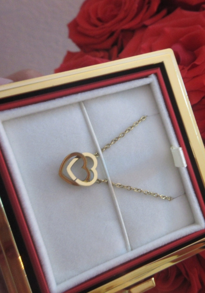 Ruotando il cofanetto, appare una collana con due cuori personalizzabili, simbolo del legame speciale con la persona che ami.