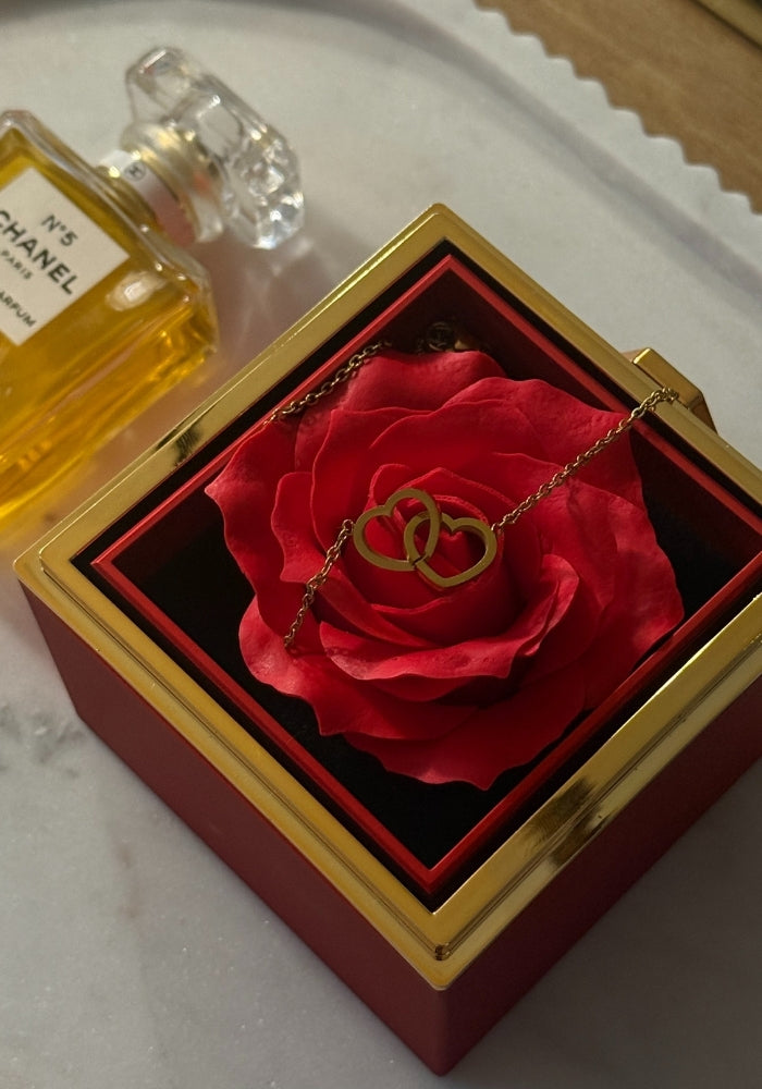 Un cofanetto di rose che custodisce un segreto: ruotandolo, rivela una splendida collana con due cuori personalizzabili, dedicata alle persone che ami.